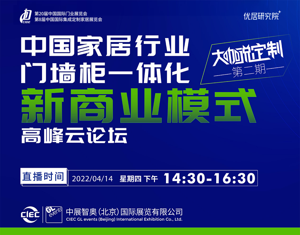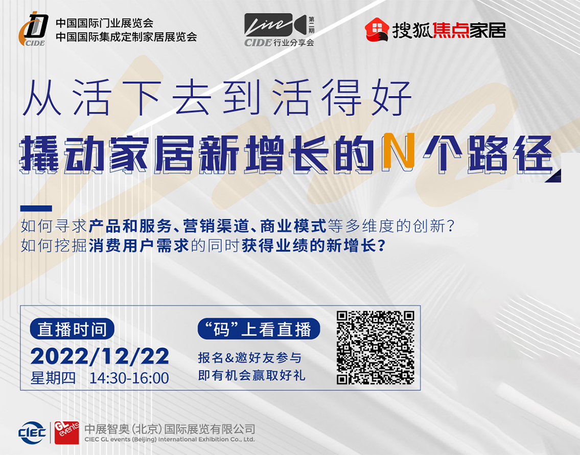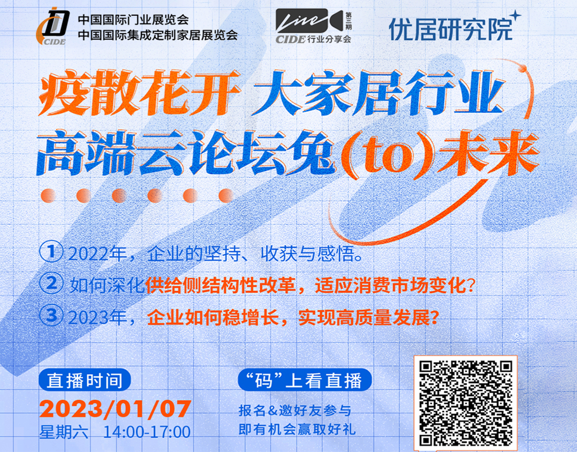 活動(dòng)簡介:穿越了低谷的2022年,隨著防疫政策的不斷優(yōu)化和“維穩(wěn)經(jīng)濟(jì)”政策的陸續(xù)出臺(tái),家居行業(yè)將迎來怎樣的發(fā)展新局面?新年伊始,CIDE北京門業(yè)與定制家居展聯(lián)合優(yōu)居研究院,集結(jié)門墻柜行業(yè)專家相聚線上,共話行業(yè)發(fā)展新思路,共探行業(yè)增長新引擎!