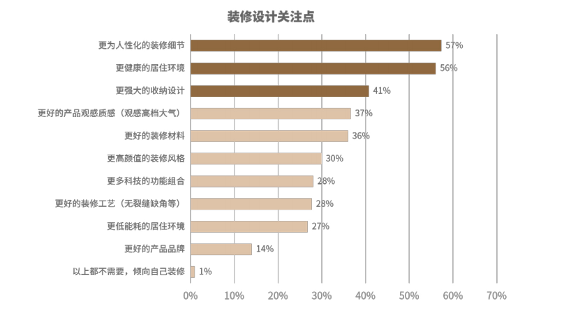 在家裝及家居的需求上,消費主力已發(fā)生變化,性價比、人性化、易清潔、環(huán)保健康及收納問題等成為重要關(guān)注點。雖然不同的城市客群生活價值觀差異較大,但構(gòu)建健康、舒適、美好的居家生活是家居消費者們共同的目標。