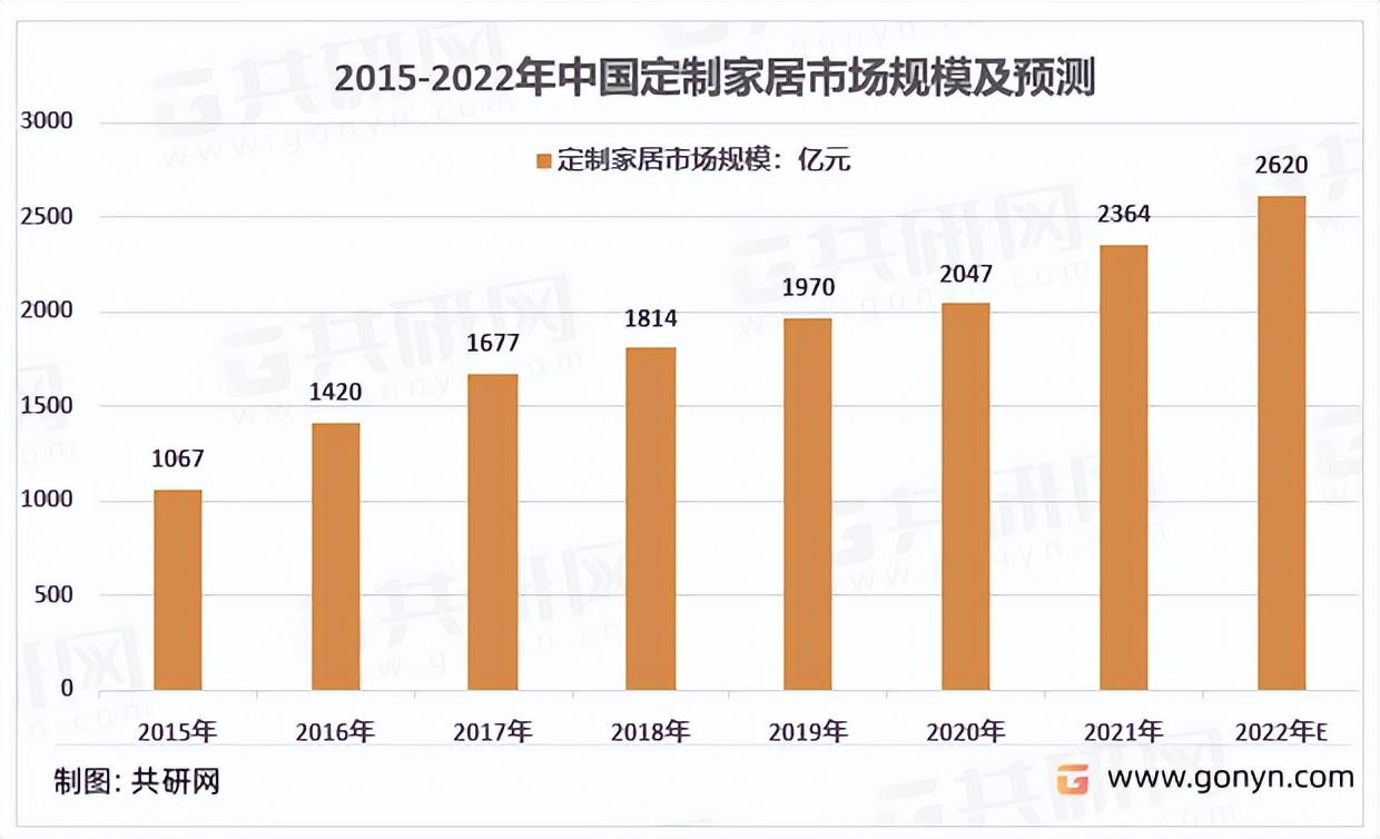 我國家居定制行業(yè)的市場規(guī)模由2015年的1067億元增長至2021年的2364億元,年均復合增長率達到13.92%。預計2022年我國家居定制行業(yè)的市場規(guī)模將達到2620億元!