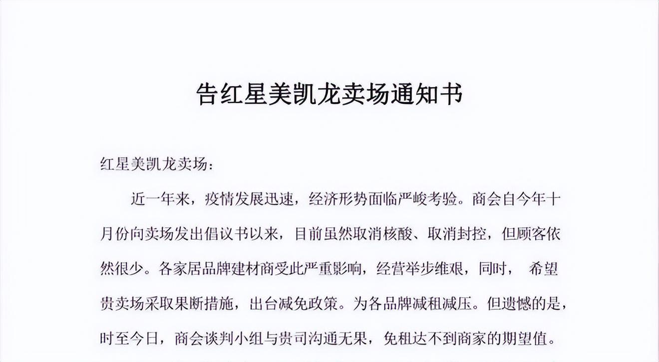 2022年12月,武漢市裝飾建材家居發(fā)展商會(huì)對(duì)武漢紅星美凱龍股份有限公司發(fā)出“停業(yè)通知書”。各家居品牌建材商受此嚴(yán)重影響,經(jīng)營舉步維艱,同時(shí),希望貴賣場采取果斷措施,出臺(tái)減免政策。為各品牌減租減壓。
