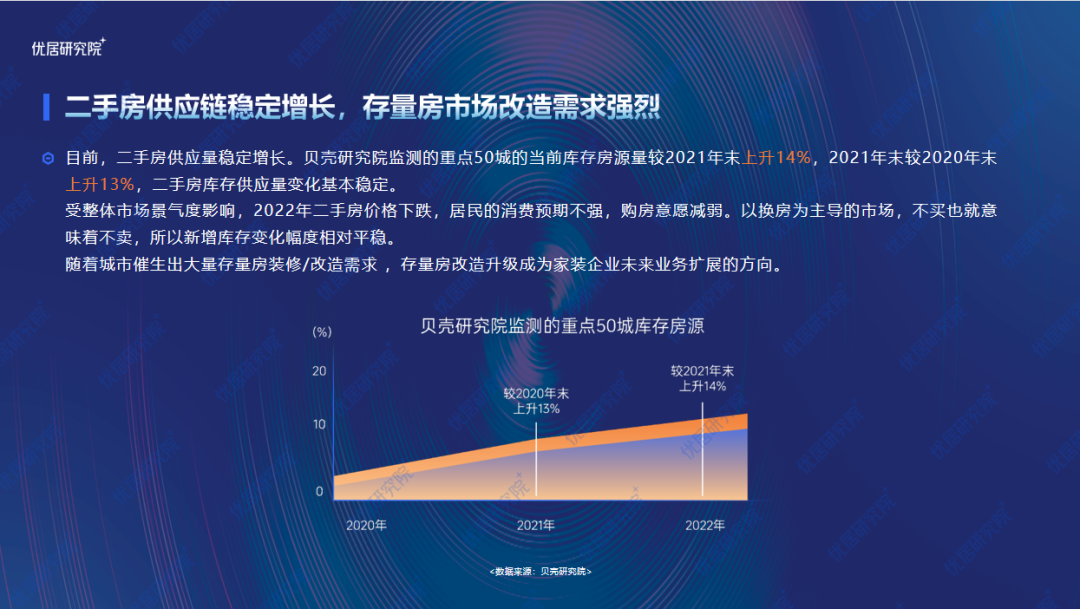 在二次裝修及改善性需求放量方面,全國一線、新一線及重點(diǎn)二線城市二次裝修和老房翻新在裝修總量中的占比已經(jīng)超過新房裝修,比例超過50%。