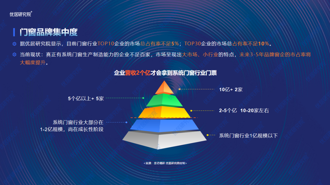 據(jù)優(yōu)居研究院顯示,目前門窗行業(yè)TOP10企業(yè)的市場總占有率不足5%;TOP30企業(yè)的市場總占有率不足10%。
